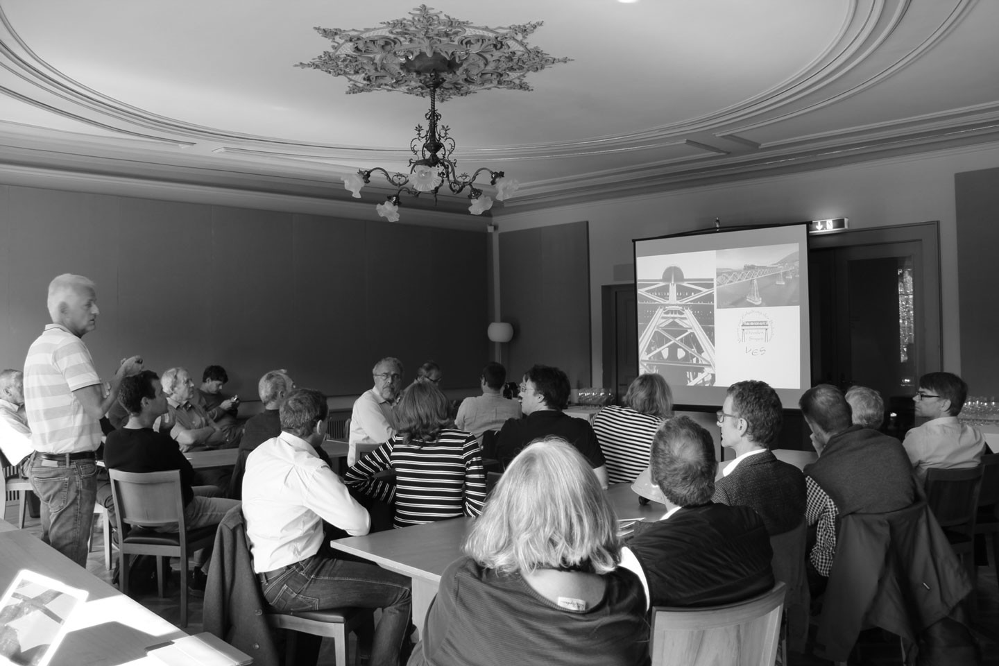 Bemerkenswert ist das damals neuartige durchlaufende Schotterbett, das die Stösse der Züge dämpfen sollte. Aber auch der Stahlbau beeindruckt durch seine Ausmasse: ein 90 m weit gespannter Fachwerkträger quert den Rhein als einfacher Balken mit zweifachem Strebenzug. Über die Dimensionen und die Höhe des Bauwerks konnten wir uns im Anschluss der Vorträge in beeindruckender und schwindelerregender Weise vor Ort beeindrucken lassen.