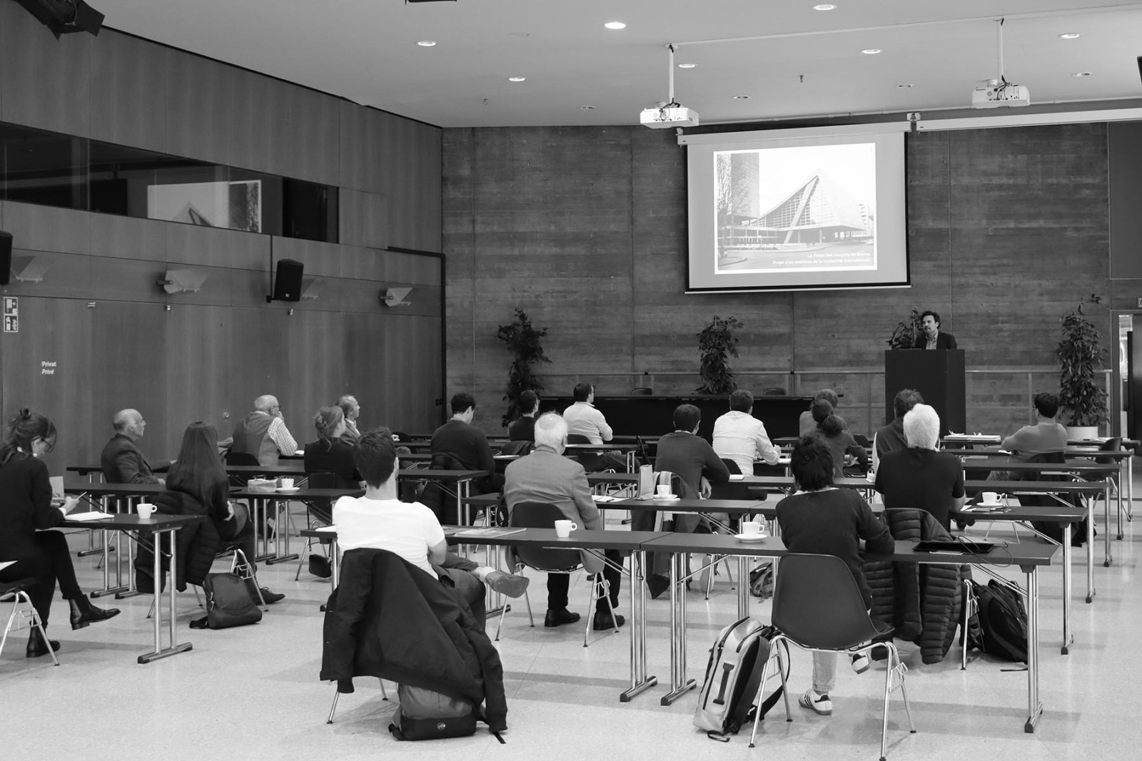 - Dr. Salvatore Aprea – Architekt und Direktor des Archivs der modernen Konstruktion an der EPFL (https://www.epfl.ch/schools/enac/acm/) – erläuterte uns die Entwicklung des architektonischen Konzepts des Kongresshauses im Rahmen der nationalen und internationalen Architekturgeschichte der 50er und 60er-Jahre.