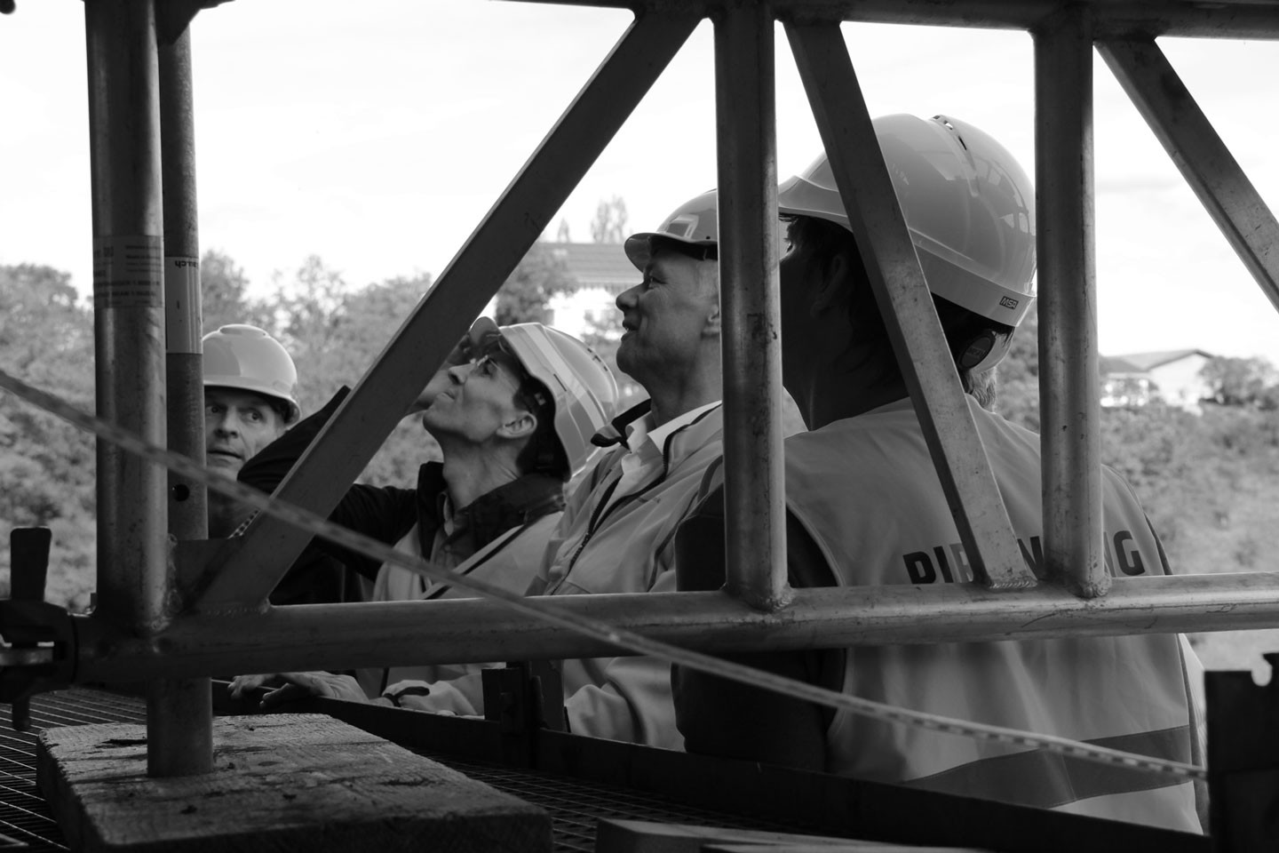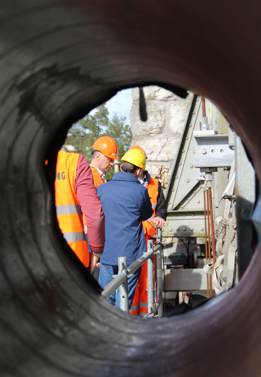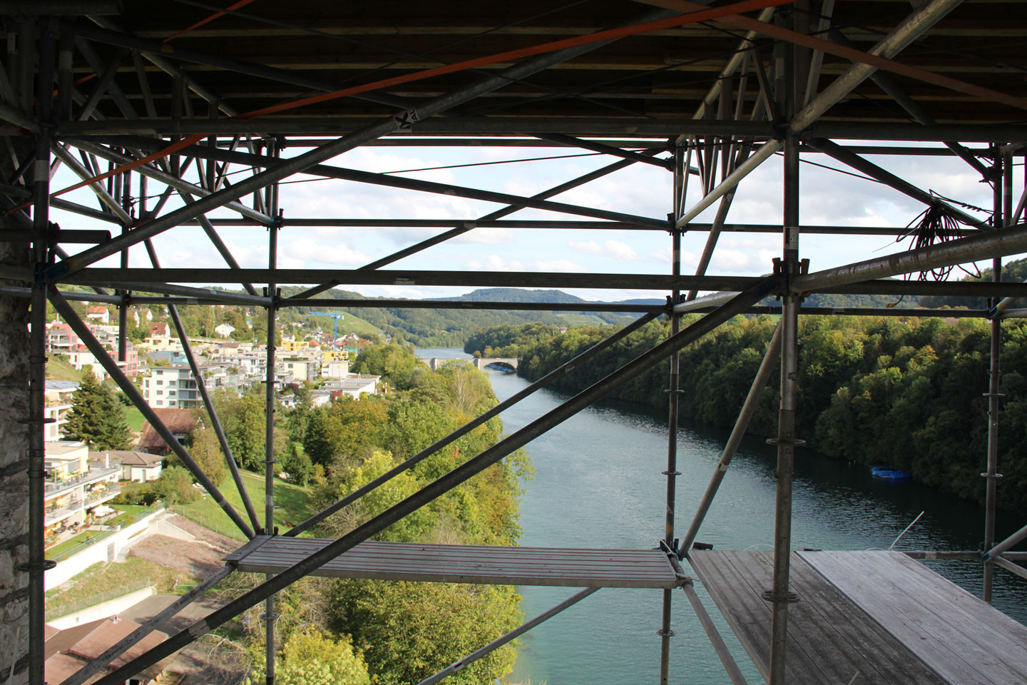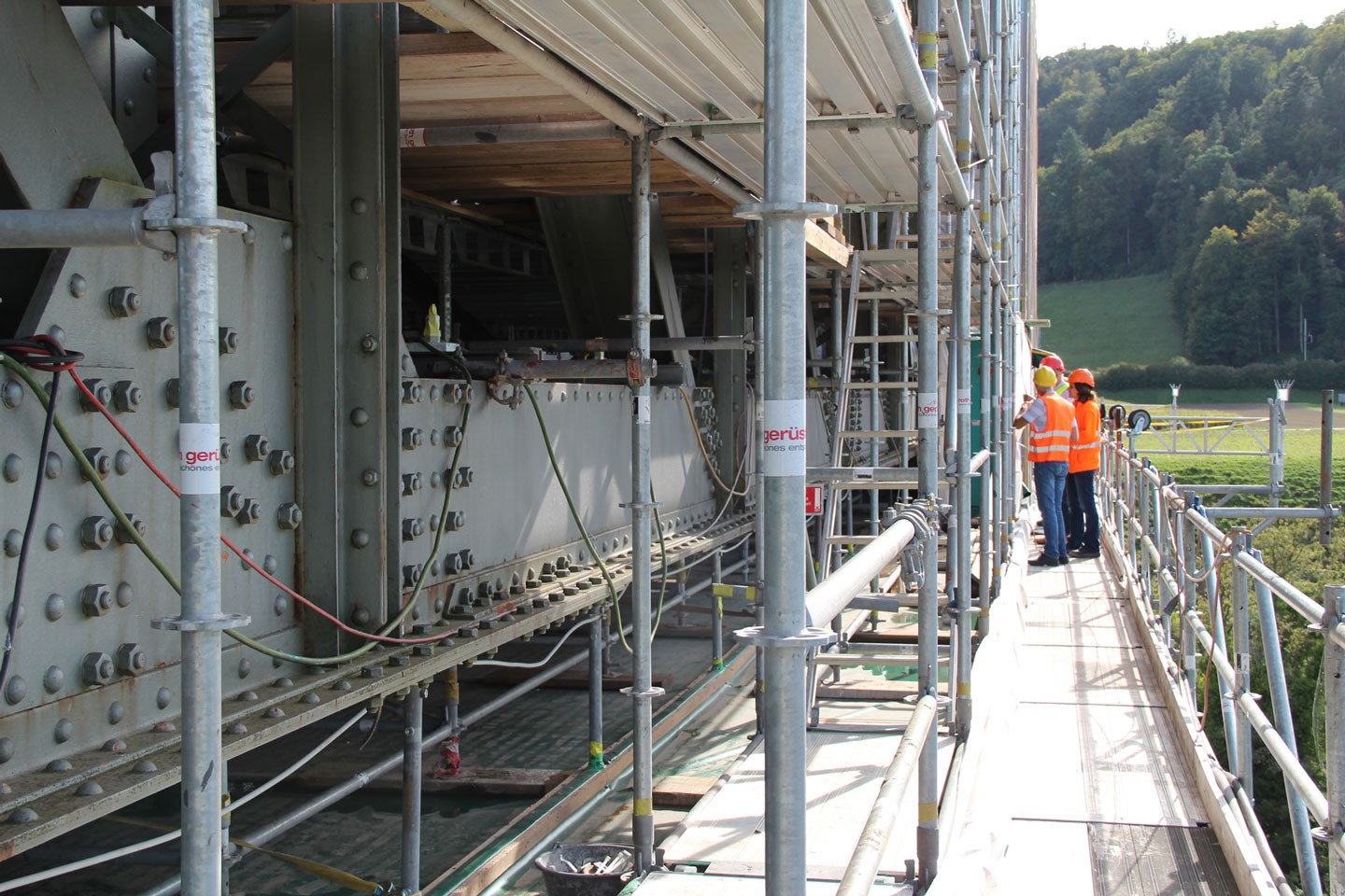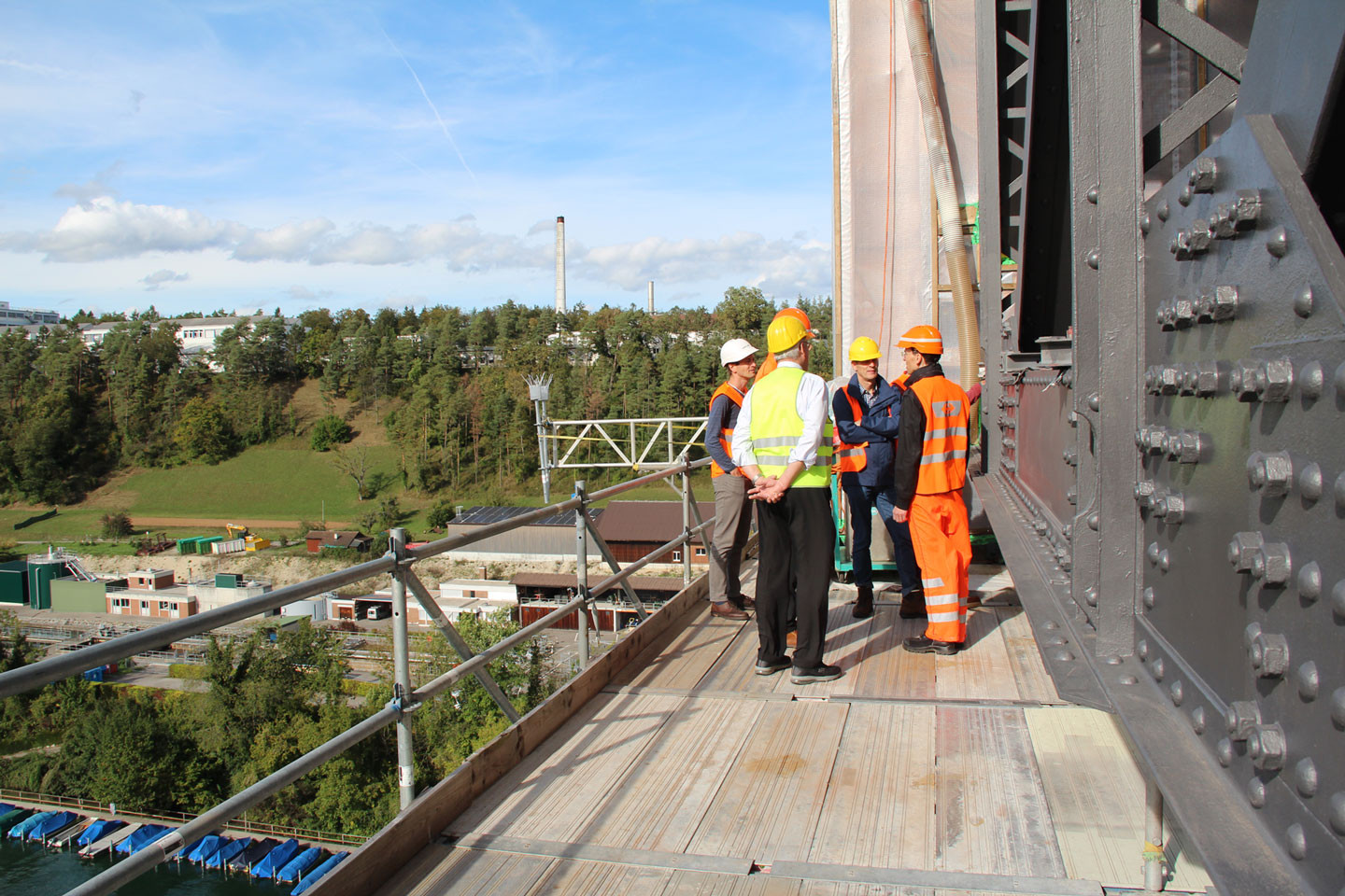 Bemerkenswert ist das damals neuartige durchlaufende Schotterbett, das die Stösse der Züge dämpfen sollte. Aber auch der Stahlbau beeindruckt durch seine Ausmasse: ein 90 m weit gespannter Fachwerkträger quert den Rhein als einfacher Balken mit zweifachem Strebenzug. Über die Dimensionen und die Höhe des Bauwerks konnten wir uns im Anschluss der Vorträge in beeindruckender und schwindelerregender Weise vor Ort beeindrucken lassen.